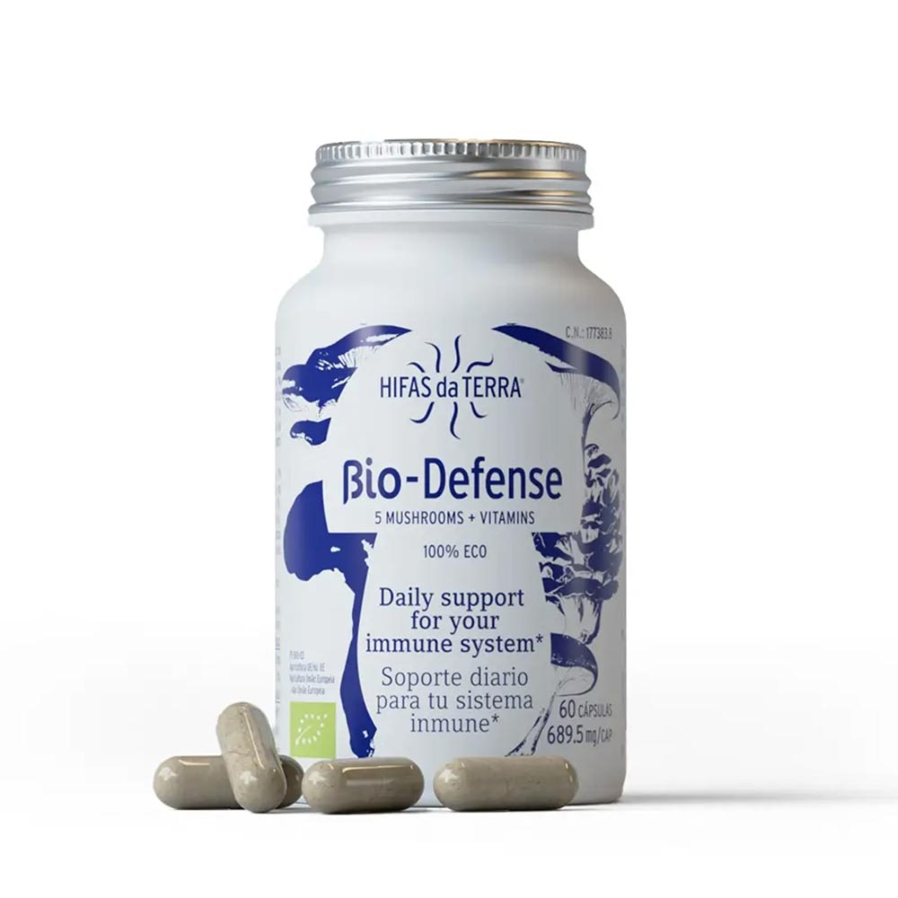 Bio-Defense es un suplemento ecológico premium diseñado para fortalecer el sistema inmunitario. Contiene extractos de Reishi, Maitake, Shiitake y Pleurotus, con un alto contenido en beta-glucanos (β-(1-3), (1-6) D-glucanos y α-glucanos), prebióticos y vitaminas C y D de origen natural.